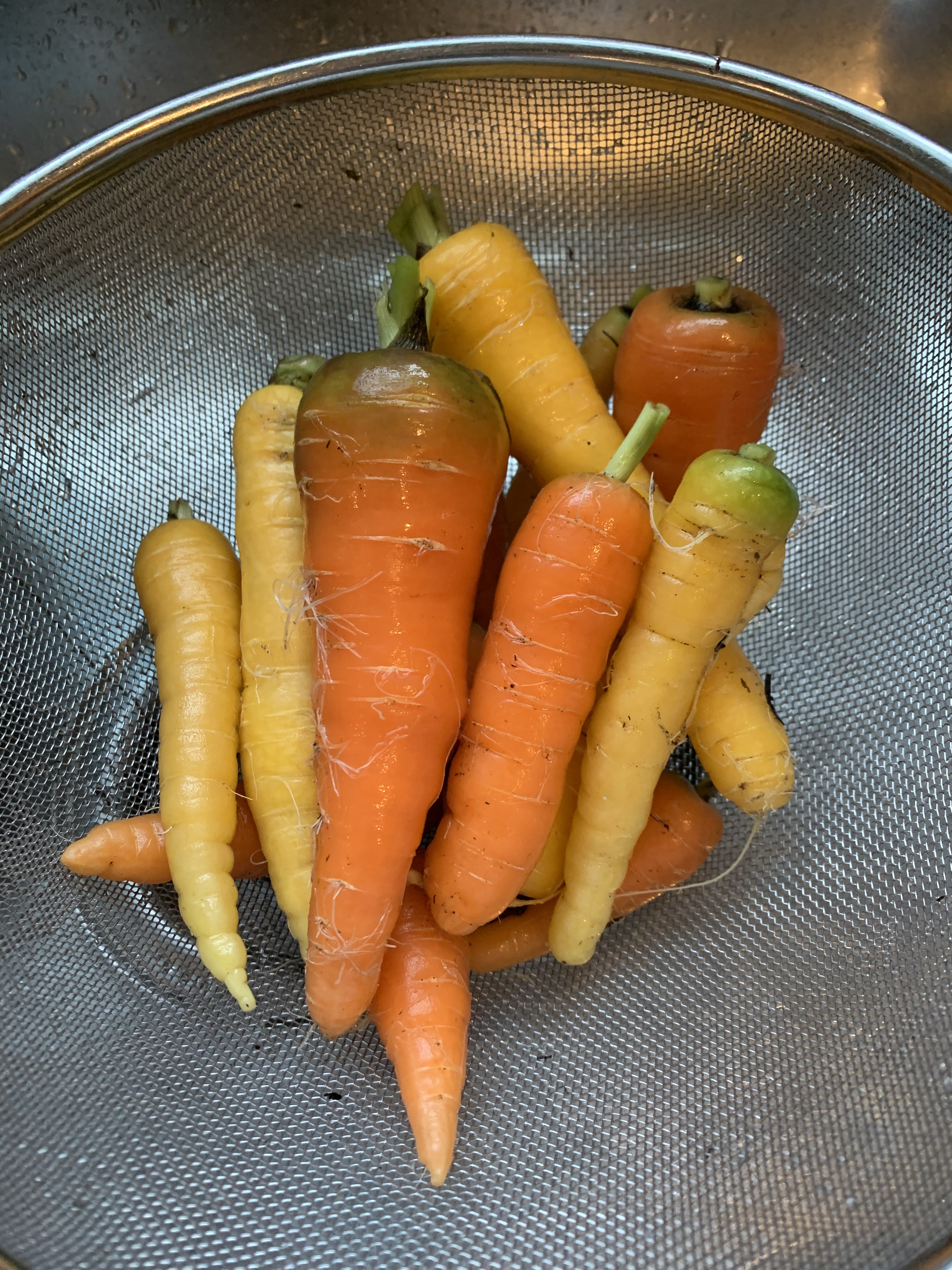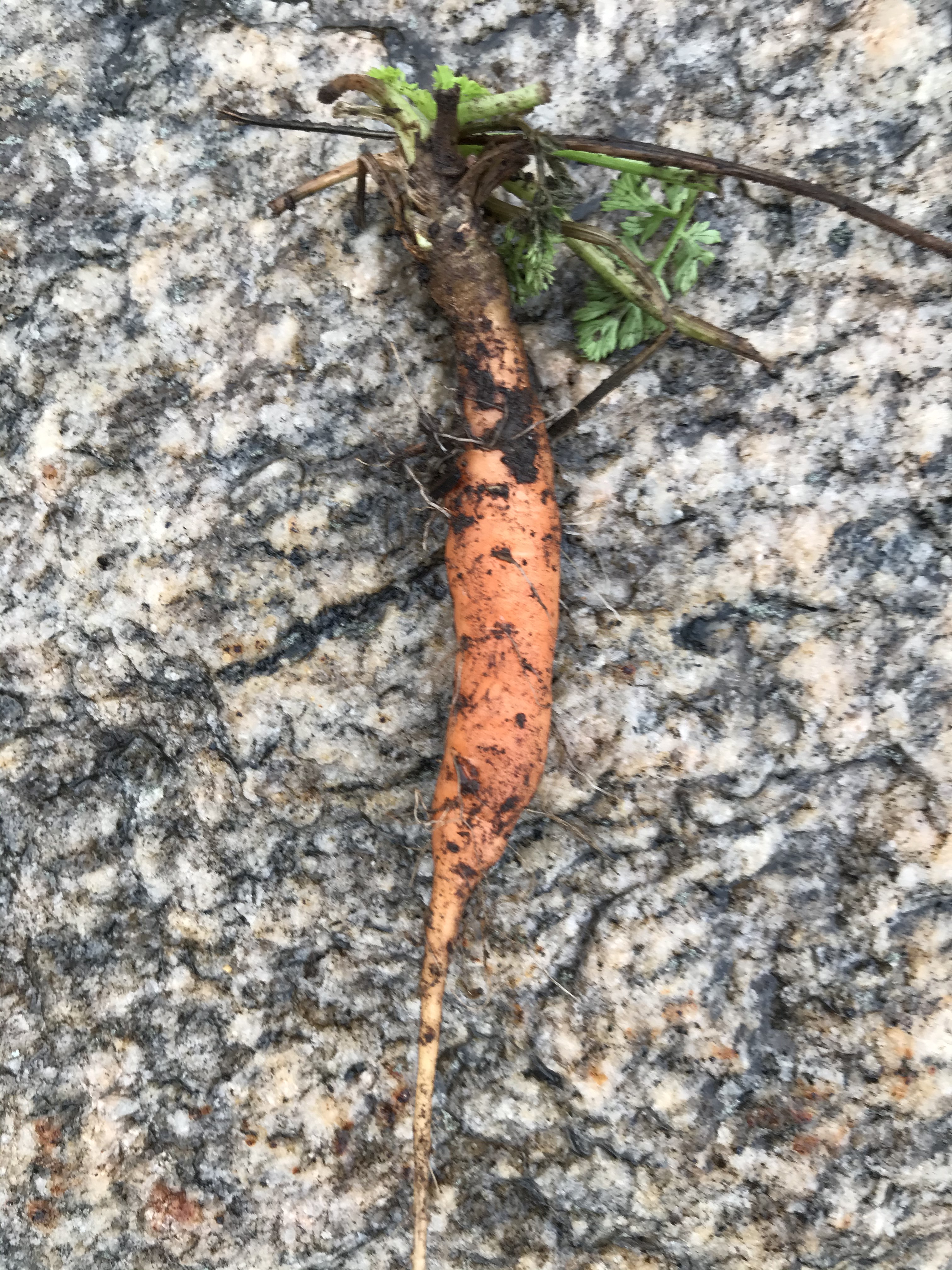 One of my favorite stories of this year’s carrot day is about the lone carrot on the bottom left of the carrot gallery. Here is what the farmer wrote about that carrot, “Here is the total result of my labors. Three carrot seed varieties, three plantings, netting, frequent watering, weeding. A carrot! I referred to it as the multitaskers carrot patch. Other challenges were drought and curious chickens.”