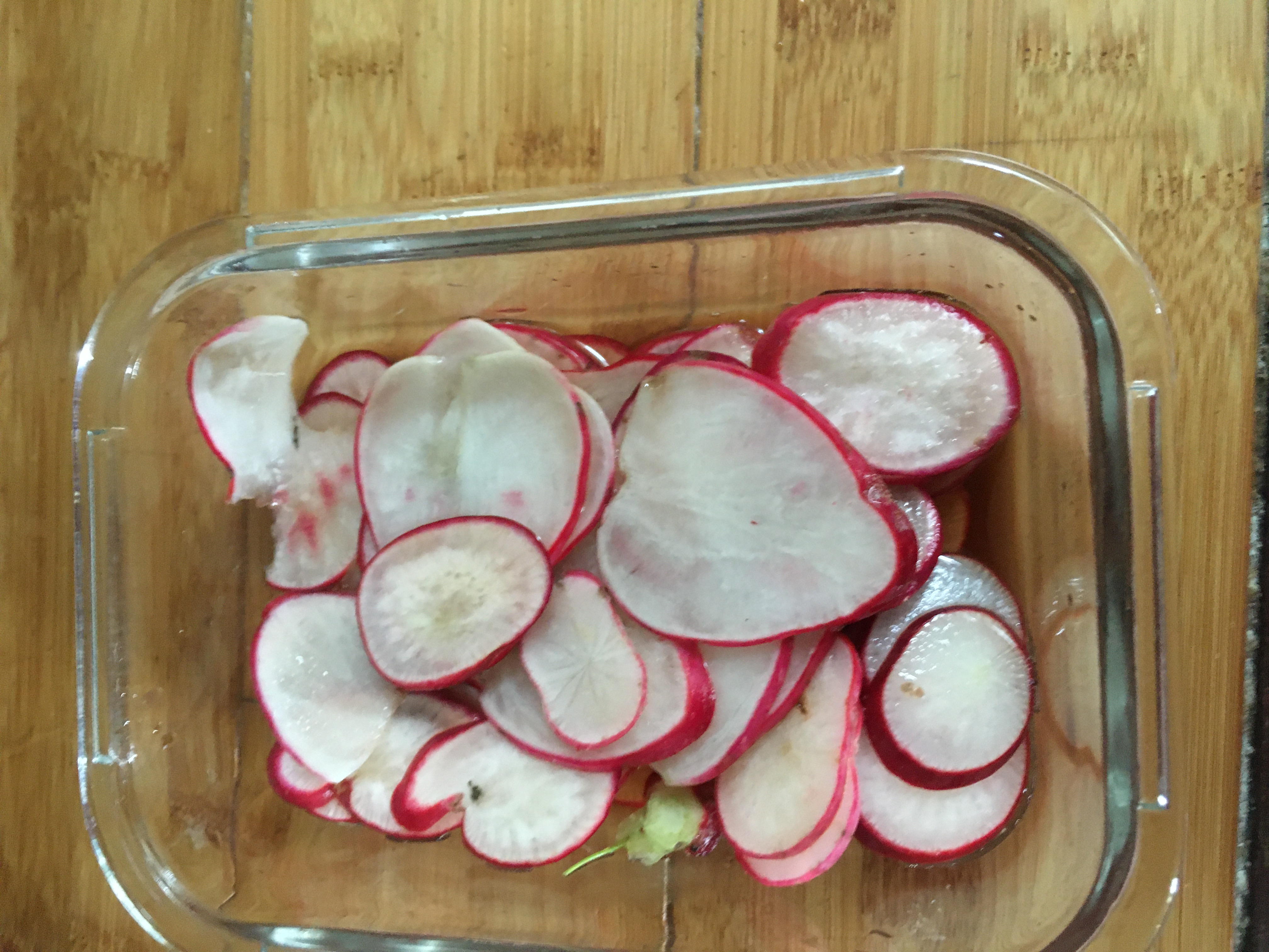 Well, using rows has certainly great for the radishes. I have been falling in love with radishes more every year and they have been really, really good this year. I slice them on a mini mandoline and then make an instant pickle with apple cider vinegar, sherry vinegar, salt and water. They make any salad or sandwich better…