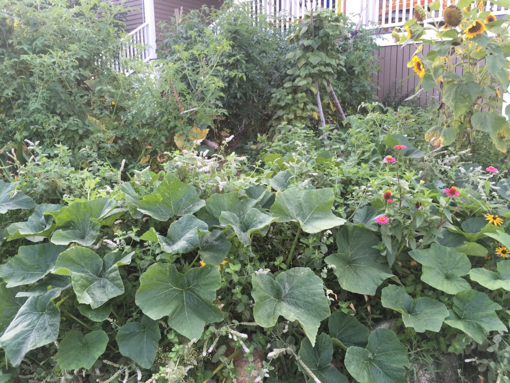 Right now my big interplanting excitement is a single butternut squash plant. Sometime in late June, I put in some seeds on the edge of the garden right at the corner where the flowers, mint, and vegetables coexist. I did not see the butternut squash for weeks. But a single seed germinated and lived and one day while picking cucumbers I saw the plant. …. Well, the cucumbers are now gone and the squash is taking over the cucumber’s space and the space of the tansy and mint. The butternut squash has grown to twenty feet in one direction and ten in the other. It is growing amongst and over the tansy, asters, zinnias, black-eyed Susans, and mint. It seems to grow almost a foot a day. But not all is well with that butternut squash plant as the first leaves are starting to die off and I fear that disease may be moving fast as well. Will the plant produce 10 – 12 beautiful butternuts or two of three that exist now and will mature even if the plant dies? I don’t know but I am very curious to find out. I am not that hopeful about the butternuts but also not that worried as I am not dependent on those squash for survival.