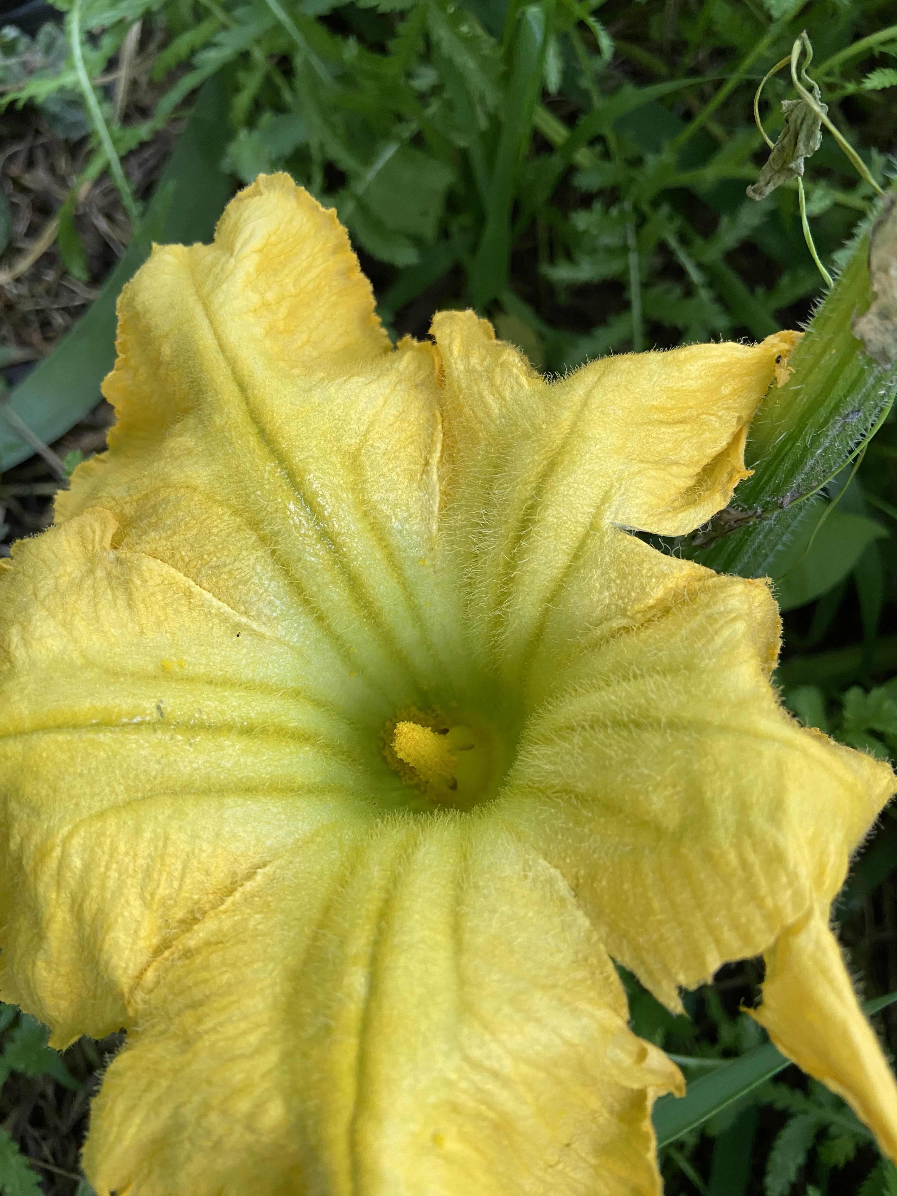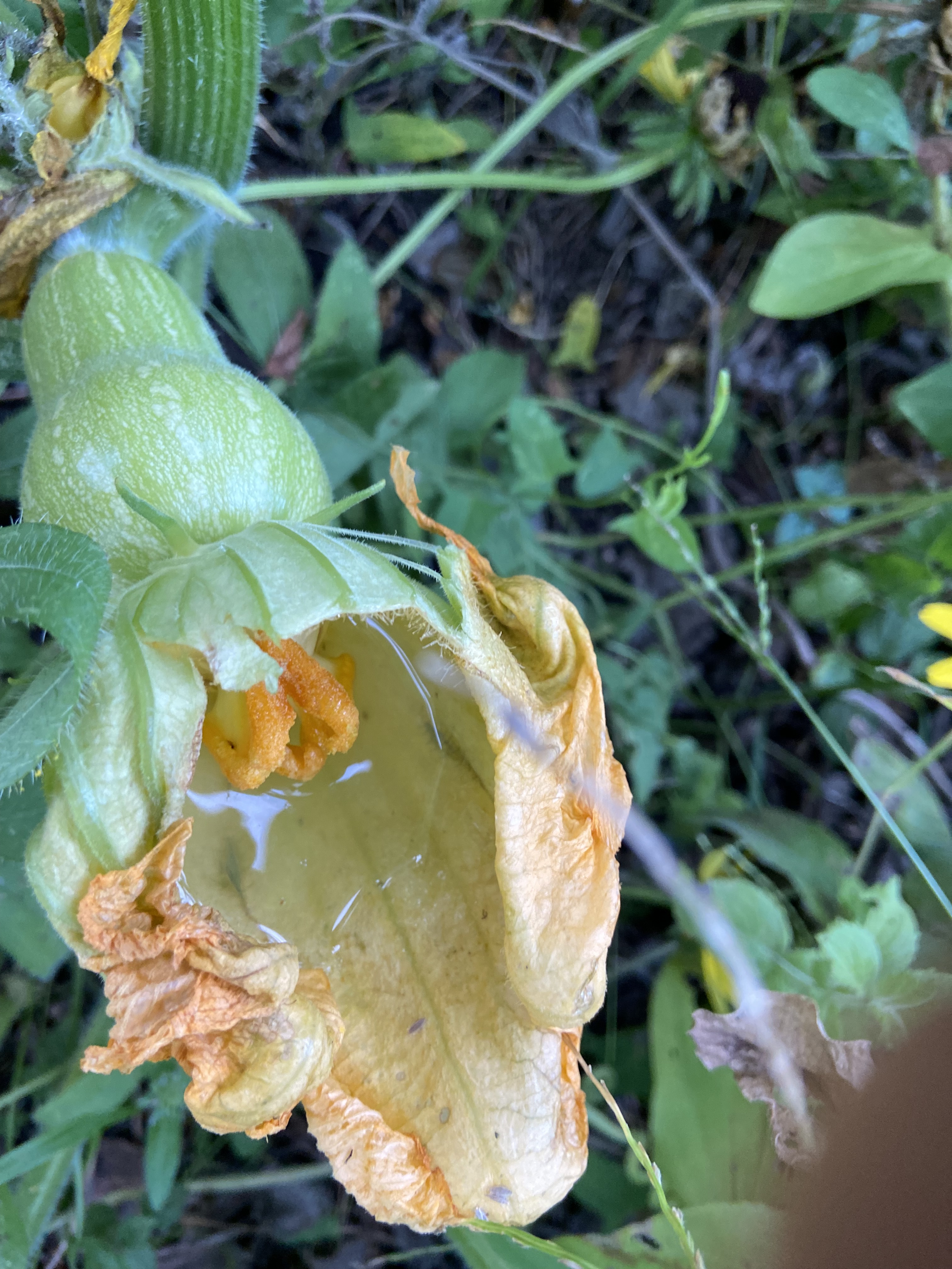 At the end of August I was unsure about the butternut squash’s chances and while other squash in the neighborhood in other gardens have now died off this butternut squash has thrived. It is now 75 feet in length and with six big beautiful butternuts and one or two small ones that I am fairly certain have been pollinated and are on their way. Most of these squash were pollinated by insects but as I tired of seeing promising squash embryos turn yellow and fall off undeveloped, I started to hand pollinate the flowers.