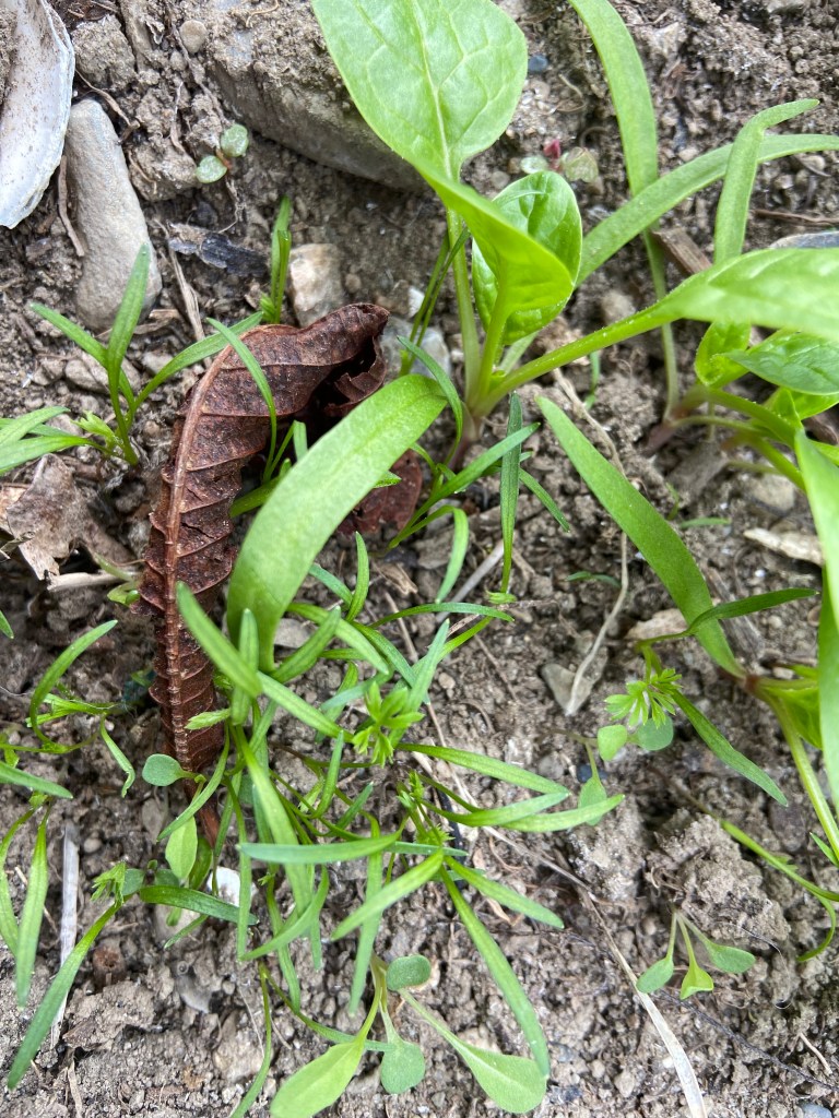 Again this year I am using intercropping or interplanting. In this gardening method I plant in the same bed many different vegetables with the goal of harvesting and eating from that bed all season. In the bed, pictured below, are chard, beets, spinach, kale, lettuce, radishes and arugula. Right now I am picking and eating the thinnings of all. The first vegtables to be gone will be the radishes, then the spinach, then the lettuce. The beets, and arugula will last all summer, and the kale and chard will provide until fall. In the past few years it is the chard that has lasted the longest producing beautiful greens into November. All these different varieties of plants do make the decision making around thinning harder but I don’t worry too much when I pull one plant instead of another. I am not seeking perfection but I do try to build the soil and grow as much as I can. Interplanting with the goal of continuous harvest helps with both. The soil is much less worked and the spacing interplanting allows means that the room the mature kale, chard and beets need will be utilized by other faster growing plants which mature much more quickly. With interplanting you can grow more in less space.