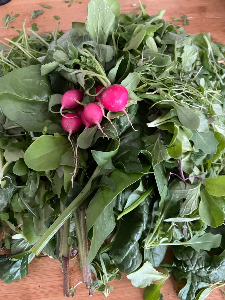 I have just come in from the garden after thinning greens and pulling a few radishes and below is the harvest.